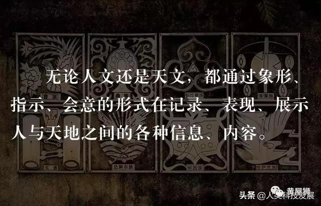 要清楚什么是文明,就必须先明白另外一个词——“文化”。文化这个词的解释在许老师的《国学之道》第一讲已经为大家展开。“文化”一词起源于《易经》中火贲卦的《彖》辞:“刚柔交错,天文也。文明以止,人文也。观乎天文,以察时变,观乎人文,以化成天下。”文化的产生,第一步来源于人类认识自然,了解天文地理、时空变换;第二步则是人类通过思维和思想意识,去利用、改造自然,产生出为人所用的产物。文化,即人文化成,它是一种人与自然互动的产物和结果。而文明则是以“文”来记录、传播、展现、表达人文化成的过程。这个“文”非常有讲究,汉语中的文与字实际是两个概念,只是我们后人已经淡化了这些重要的概念。文是文,字是字,许慎《说文》中讲“依类象形谓之文,形声相益谓之字”。“文”是象形、指示、会意的直接表达形式,“字”是对形声、转注、假借的表达形式。所以,无论是人文还是天文,都是通过象形、指示、会意的形式在记录、表现、展示人与天地之间的各种信息、内容。这也就让人们理解,那些出土文物上留有的图腾、纹饰、符号不是简单的装饰或者随意画的,里面实际都蕴藏着重要的事物信息与内容。